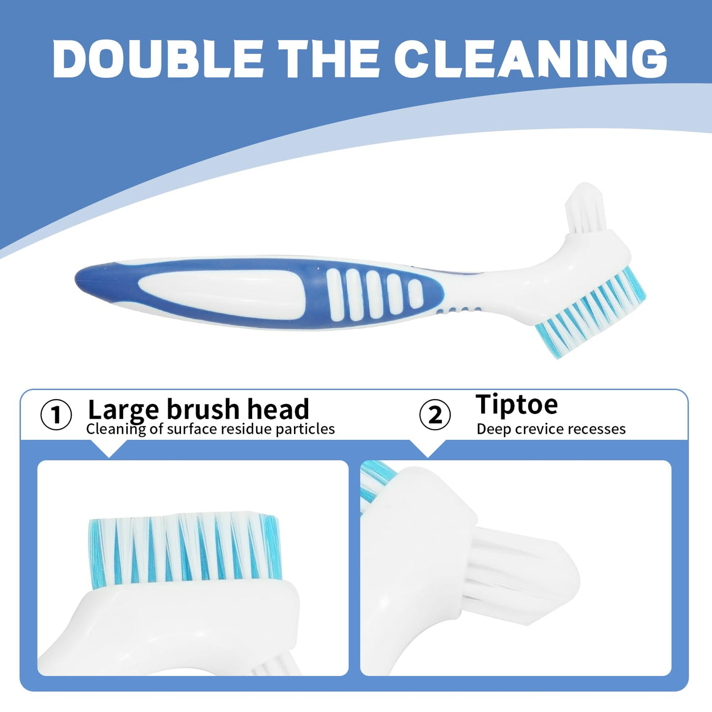 - Double-head design: The large brush head removes surface dirt particles, while the small, pointed brush head excellently cleans every corner of the denture, even hard-to-clean hidden areas.