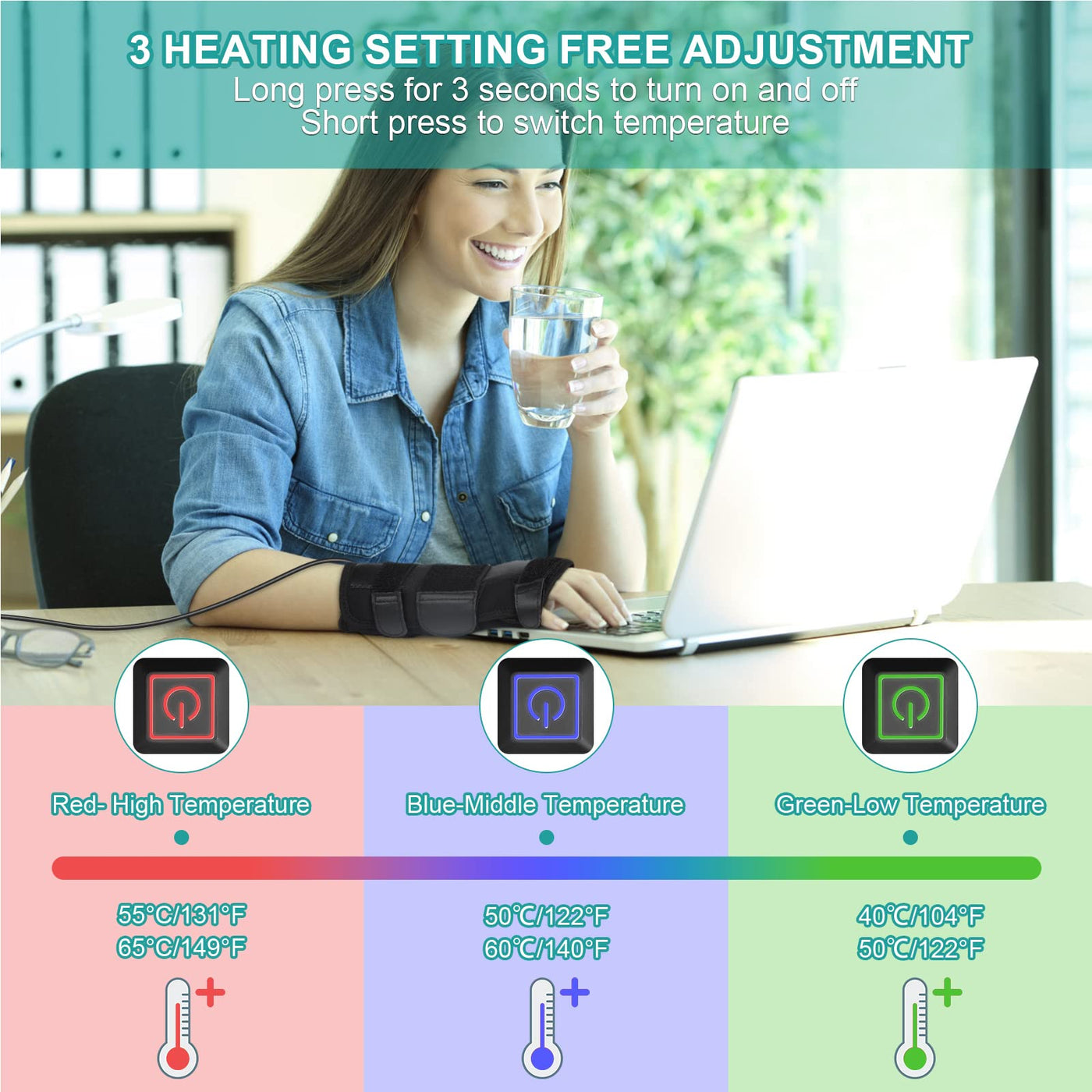 - CUSTOMIZABLE TEMPERATURE SETTINGS HAND PAIN: One button control and easy to operate. Long press the button for 3s to turn it on/off. The wrist heated brace has a LED on the front , There are 3 colors led display to show its temperature. customizable designs for your best fitting temperature for warming or heat therapy. Automatic power off when overheated. 2-hour auto-off so you can relax in comfort with confidence. Please use the included DC adapter if you need a higher temp.